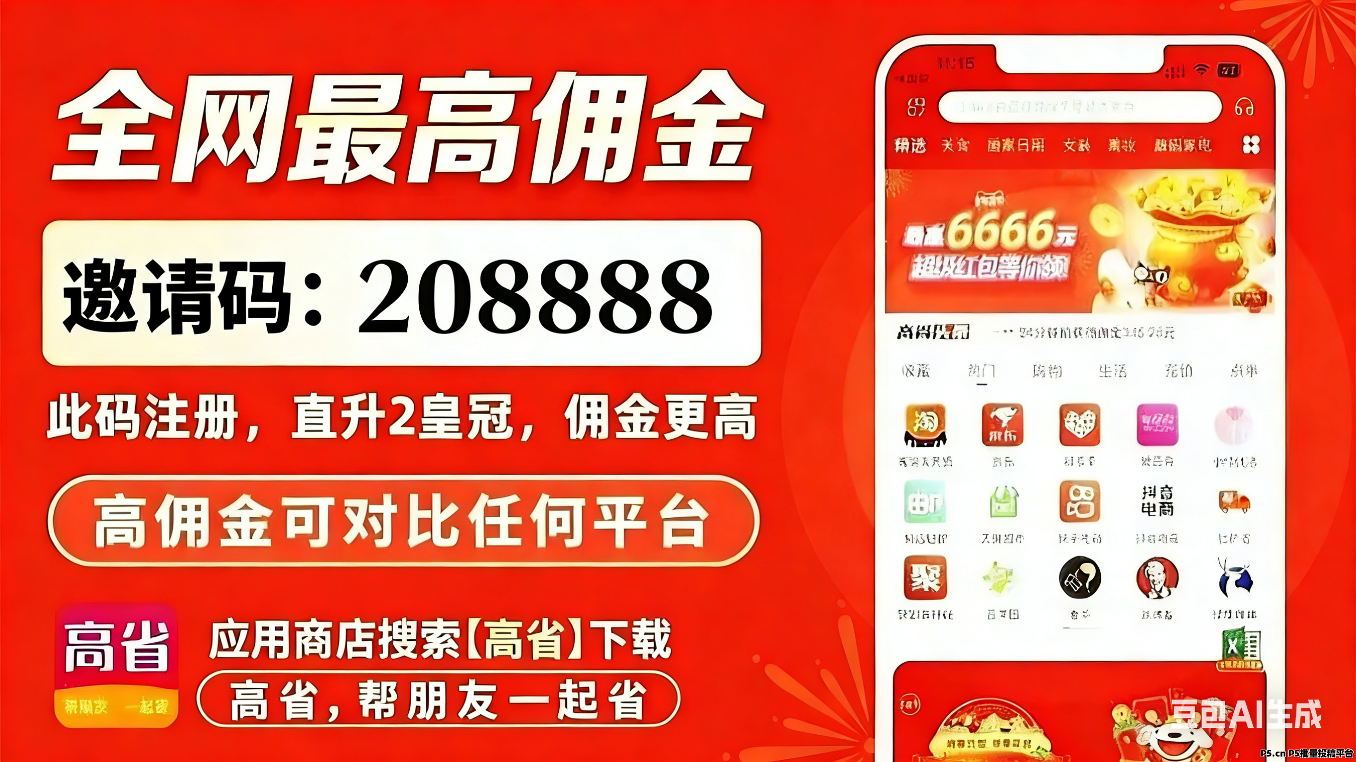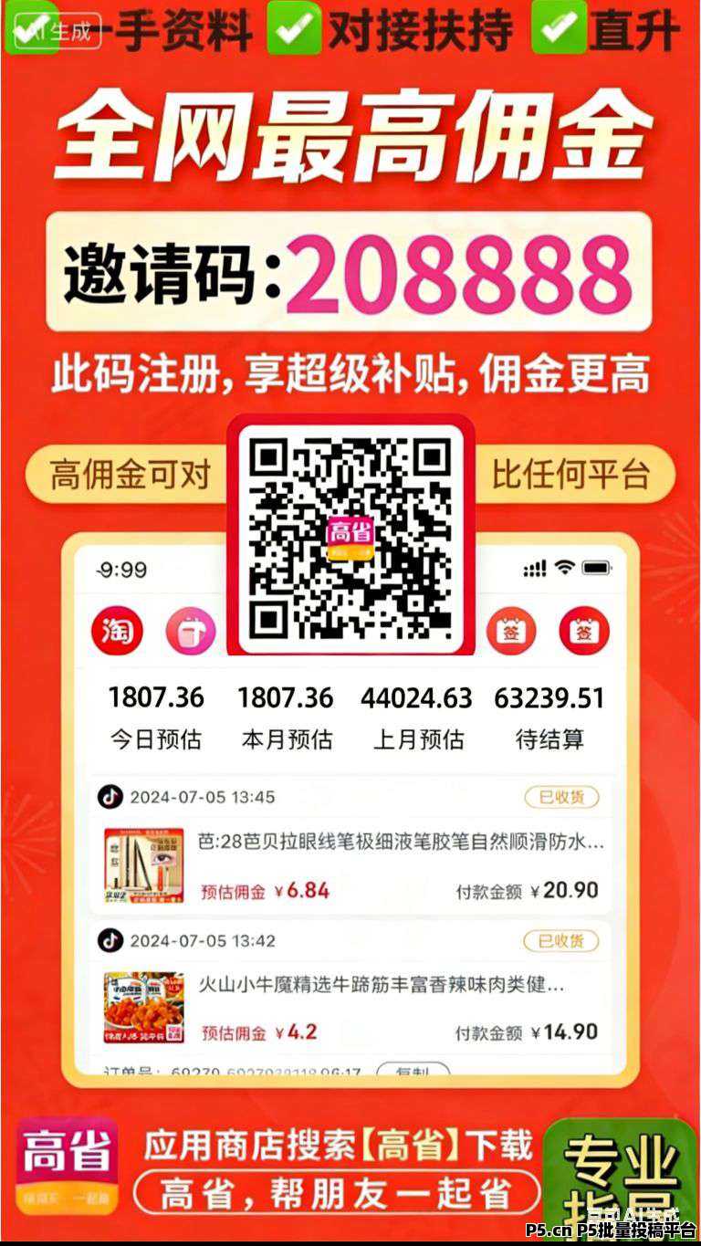 你可直接前往手機官方應用商店,搜索下載高省APP,填寫邀請碼208888注冊,即可直升雙皇冠等級,開通推廣權限,開啟你的增收之路!